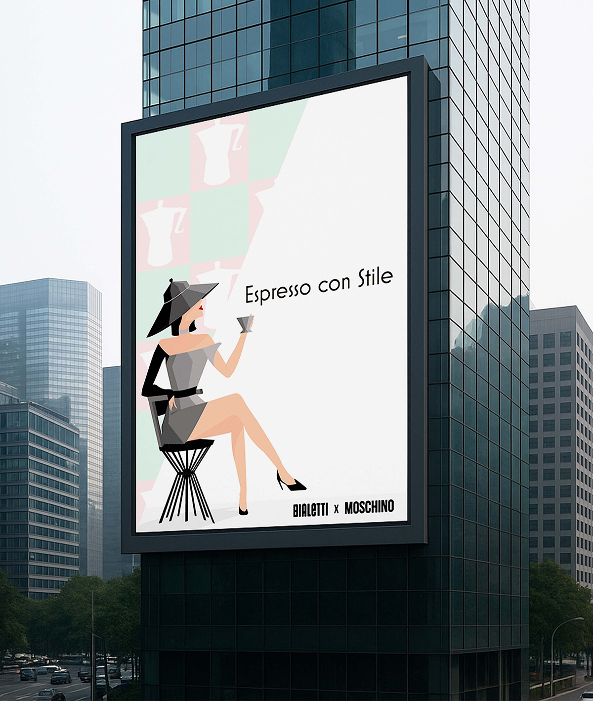 Dieses Projekt entstand im Rahmen eines Schulauftrags und interpretiert die ikonische Bialetti-Espressokanne als fiktive Fashion-Kollaboration. Ausgangspunkt war eine Recherche zu Bialetti-Plakaten, in denen die Kanne mit menschlichen Formen kombiniert wurde. Daraus entwickelte sich die Idee, die Bialetti als Kleid zu inszenieren und sie mit Moschino in einen modischen Kontext zu setzen. Wichtig war mir, dass das Plakat trotz der ungewöhnlichen Idee eine gewisse Eleganz bewahrt und das Kleid glaubwürdig wirkt.